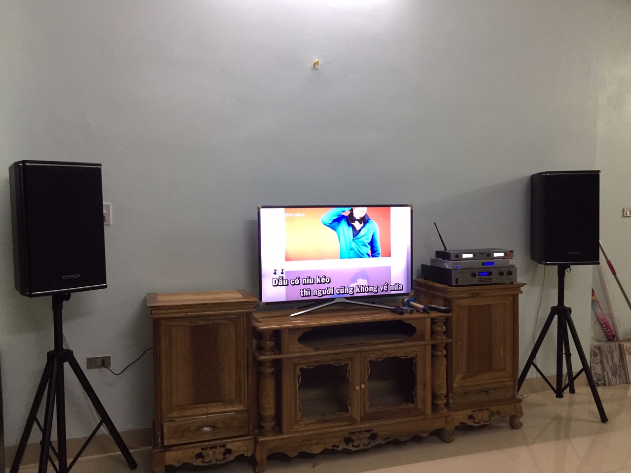 Vì nhà mình nhỏ, và không muốn treo loa, nên mình sử dụng loa kích thước nhỏ ( JBL Ki-08) kết hợp với vang liền công suất CARD DSP-K350, đầu phát Himedia Q10 Pro tiện lợi cho cả Karaoke và xem phim HD online. Micro AAP K900F thì chất lượng rất tuyệt vời.